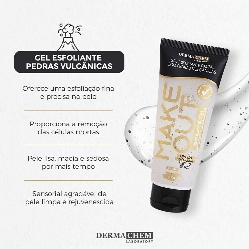 O GEL ESFOLIANTE FACIAL COM PEDRAS VULCÂNICAS DERMACHEM em foi desenvolvido com compostos de microesferas minerais de origem vulcânica vinda de Idaho - USA complexo de vulcões da região de Yellowstone com diferentes mineiras tipo quartzo, óxido de alumina, magnésio, ferro e principalmente a Silica. Esses ativos oferecem uma esfoliação final e precisa na pele, deixando com sensorial agradável de pele limpa e rejuvenescida. Efeito Detox proporciona a remoção das células mortas e sensação de bem estar, pele lisa, macia e sedosa por mais tempo. É uma esfoliação física natural que renova as células da pele. Seja bem vinda ao mundo tecnológico Make Out da Dermachem. Enalteça sua beleza.