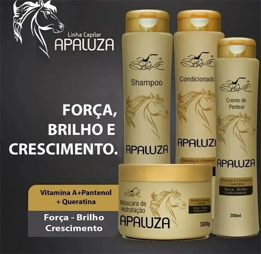 Máscara de Hidratação Apaluza - 300g A mascara Apaluza possui uma formula balanceada com vitamina A, Pantenol e Queratina.Conferindo força resistência e brilho aos fios. Modo de usar: Aplique o produto nos cabelos úmidos, massageando mecha por mecha. Aguarde 10 minutos. Enxague bem.