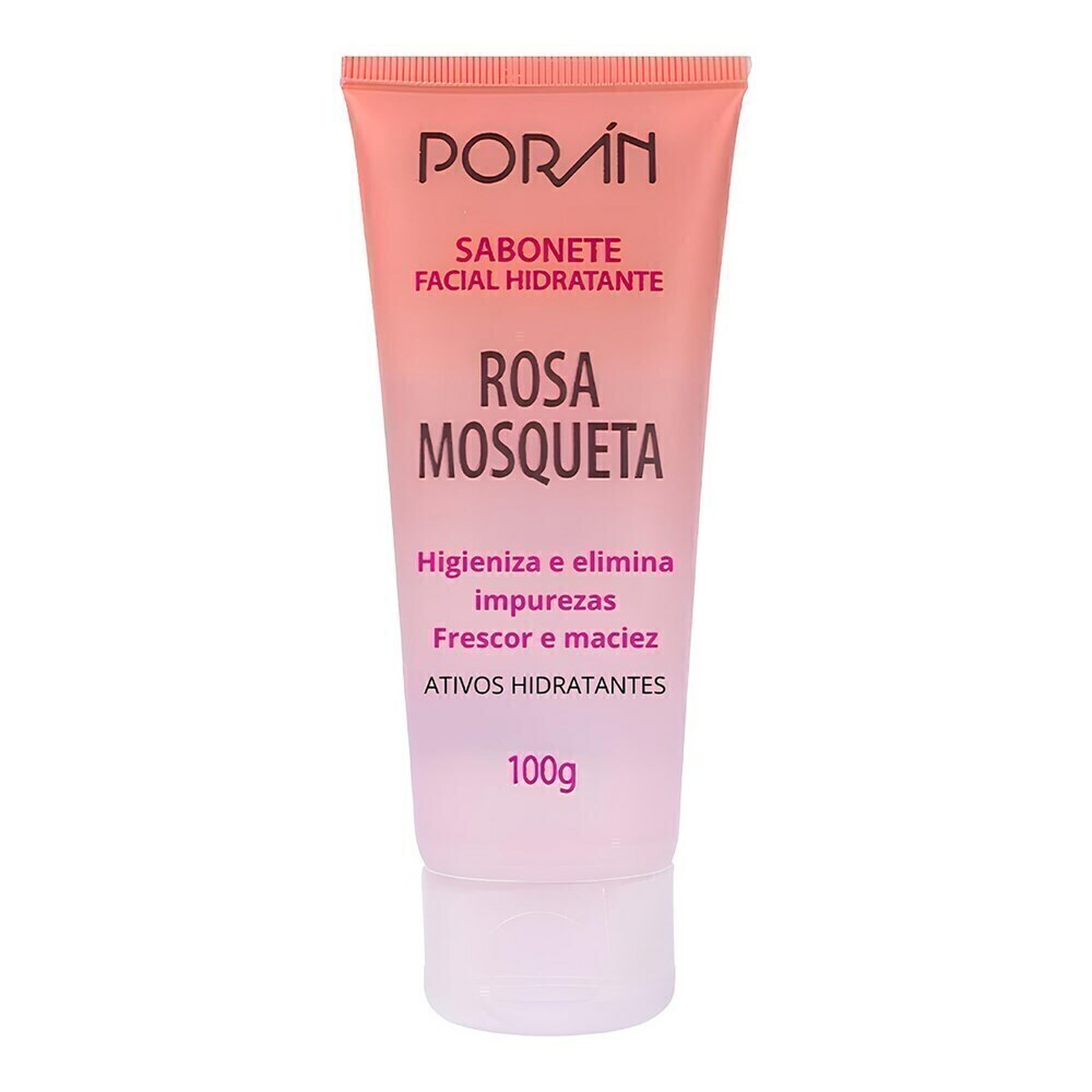 Sabonete facial Rosa Mosqueta Porán higieniza o rosto sem remover a proteção natural, elimina impurezas oferecendo frescor e maciez, possui poderosos ativos hidratantes que atuam no momento da limpeza.